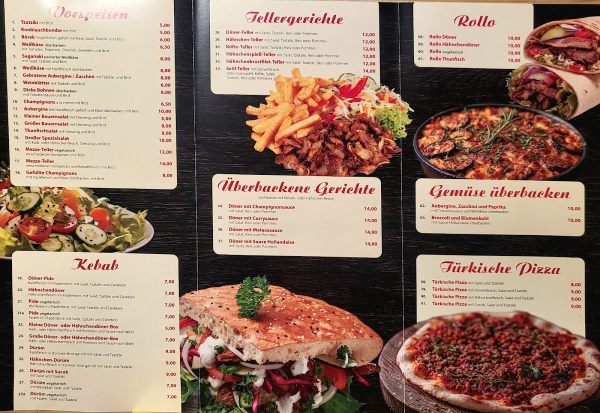 Das kleine Kebab-Haus offers a straightforward menu centered around popular fast food options with a focus on fresh, satisfying meals. Guests can expect a variety of casual bites ranging from classic Döner and gyros rolls to shareable mezze platters and hearty grill plates. The menu is simple yet varied enough to cater to different tastes, with comforting additions like saganaki or sides such as tzatziki and fresh salads.